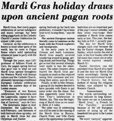 According to Catholic.org “the celebration of Mardi Gras has its roots in the pagan Roman celebration of Lupercalia. This was a February holiday and it honored the Roman god of fertility. It involved feasting, drinking, and carnal behavior. However, with the rise of the Church in ancient Rome, Christian teaching and morals took root, but there always remained a strong need to blend ancient Roman traditional practices with the growing Christian faith. The blending of tradition with new religious beliefs was a common practice in the ancient world and it helped people to transition away from paganism.” Click here for source